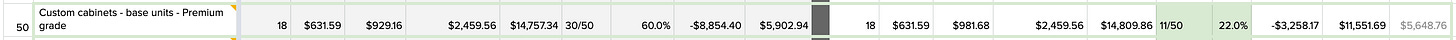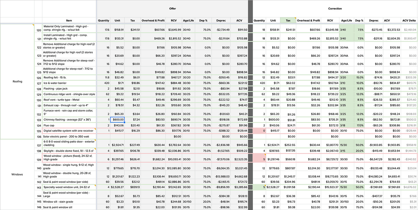 With evidence that assumptions about age for a lot of expensive items were wrong, I manually copied and pasted each of the 212 line items from our Xactimate estimate into a spreadsheet. I then reverse-engineered their functions to figure out how they were calculating things like taxes and Recoverable Deprecation. It took me about 8 hours do do all that data entry, find the deltas and prove them to be deltas.
