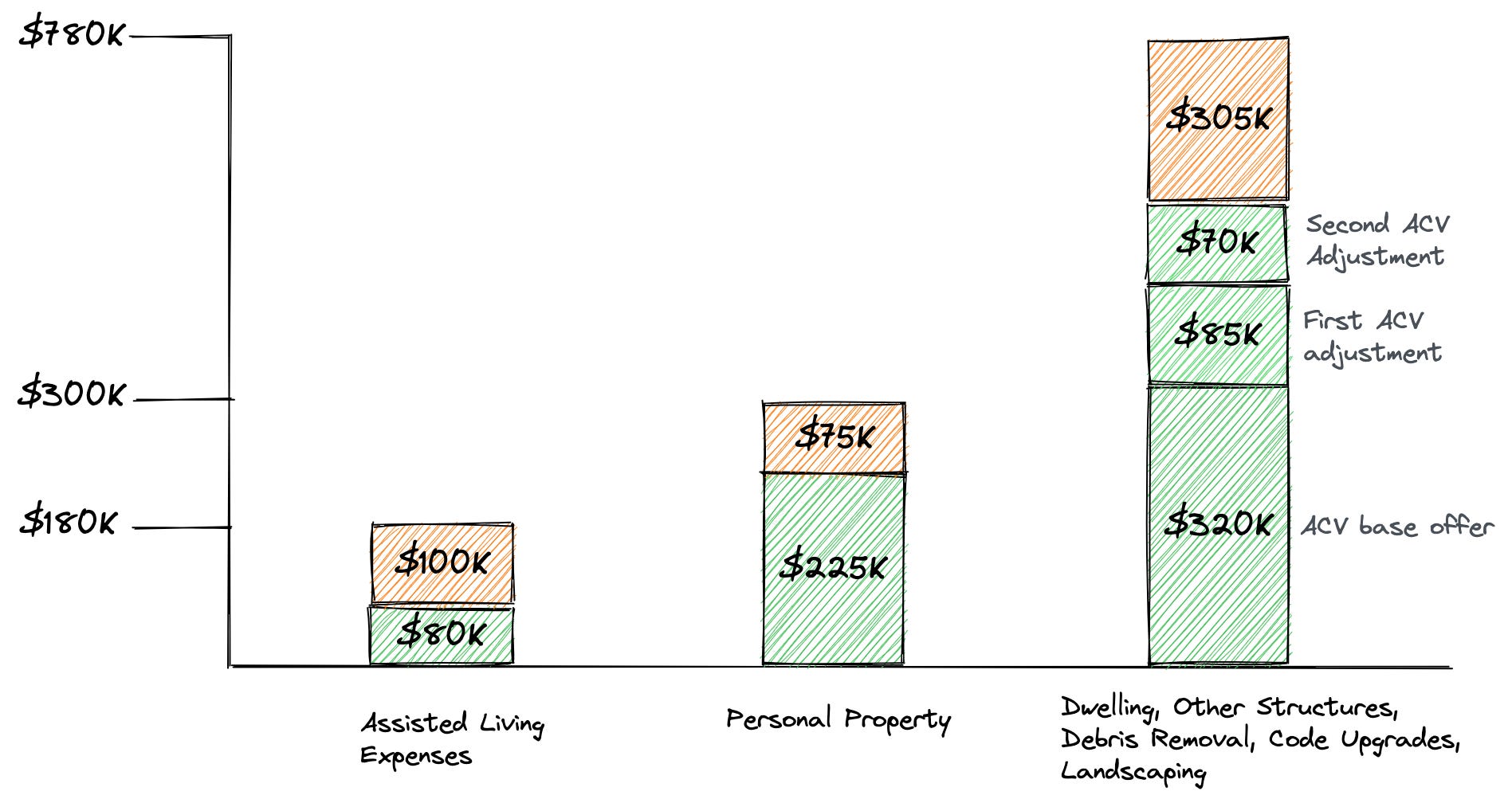 In the end, I was able to show we were owed another $67,025.85 in ACV. I sent the spreadsheet to our adjuster, and she promised to review it and get back to us by March 4th. And, promptly, on March 4th, she responded accepting all our changes, and had bumped ACV a little higher to $70,027.86.